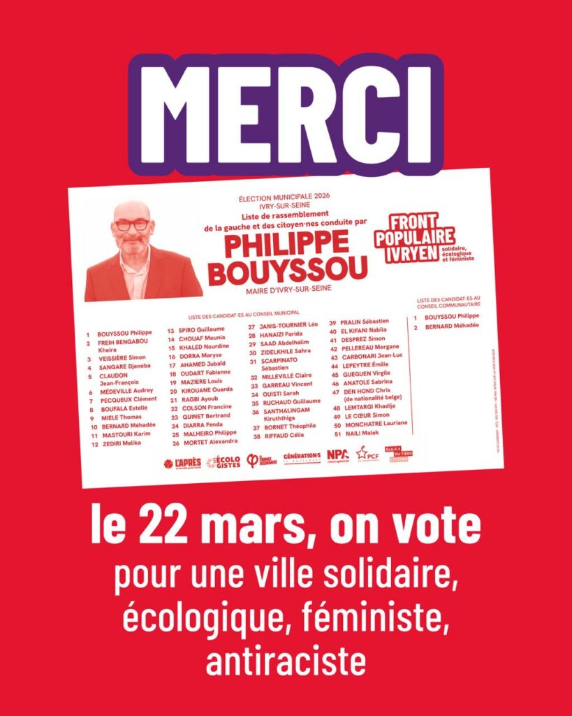 Rassemblement des forces politiques communistes, de la gauche, des écologistes, et des citoyen·nes dont l’engagement fait d’Ivry une ville populaire, solidaire, féministe et métissée Je souhaite être tenu·e informé·e Je soutiens la liste Nos actualités Ce dimanche, on se mobilise contre la droite et l’extrême-droite ! Absent·e le 22 mars ? Pensez à la procuration ! Meeting final – Front Populaire Ivryen 15 bonnes raisons d’aller voter pour notre projet dimanche 15 mars ! Mercredi 18 février, présentation des candidat·es et du programme Les candidat·es citoyen·nes et conseiller·es associé·es Nous suivre sur Instagram et sur Tiktok
